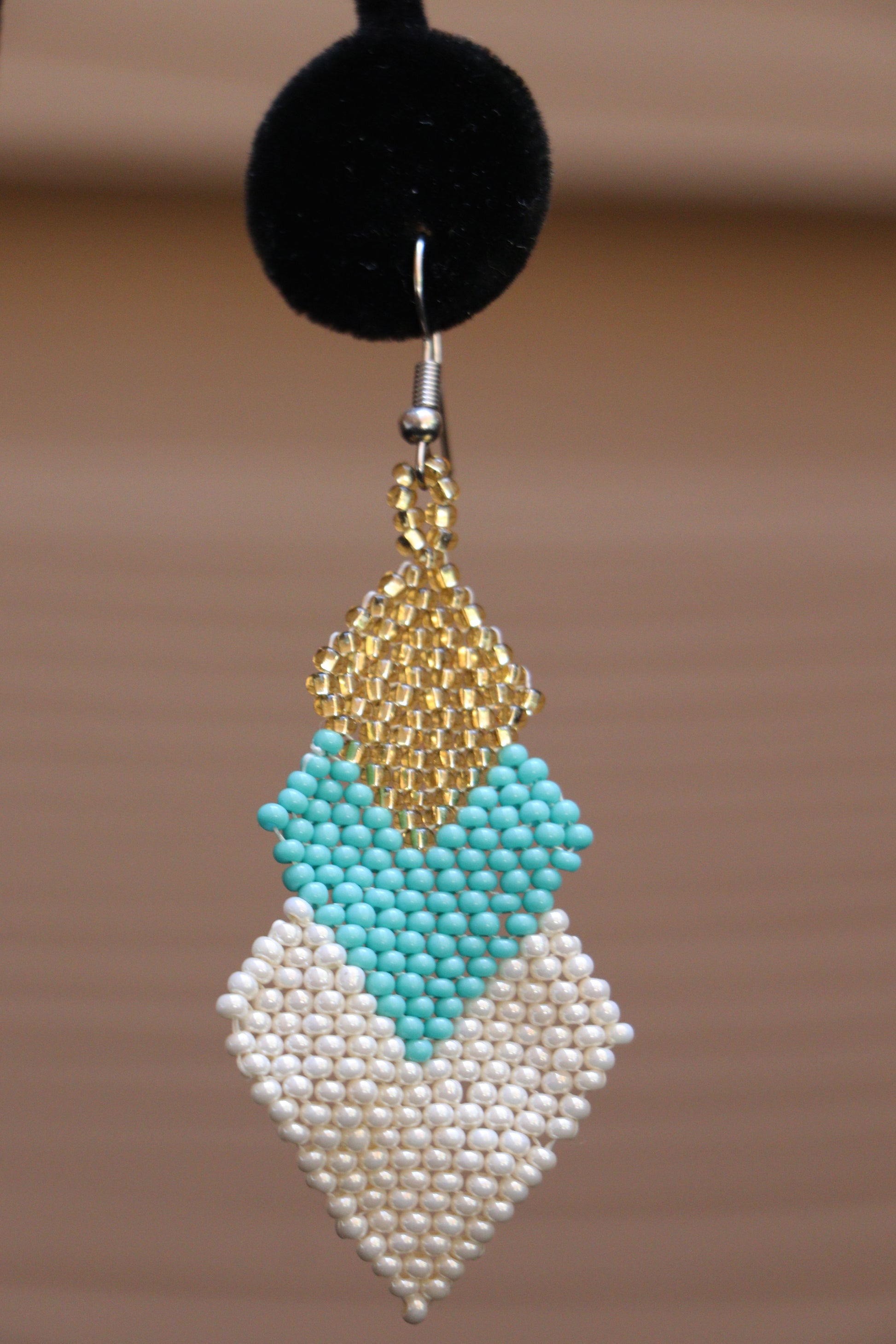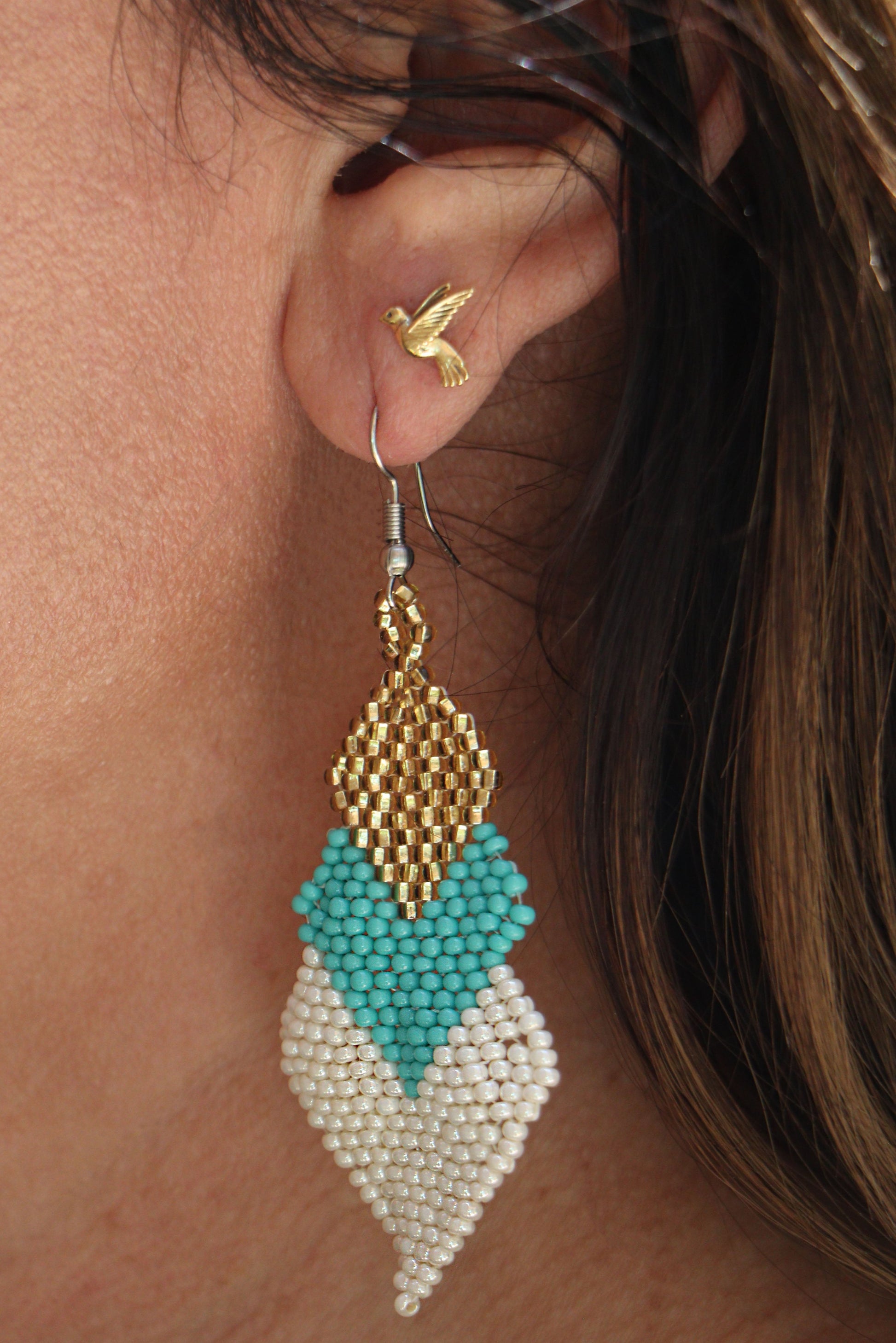 Handcrafted in Mexico, these tri-colored earrings feature a blend of white, turquoise, and gold beads. Lightweight yet refined, they add a touch of sophistication to any outfit with effortless charm.