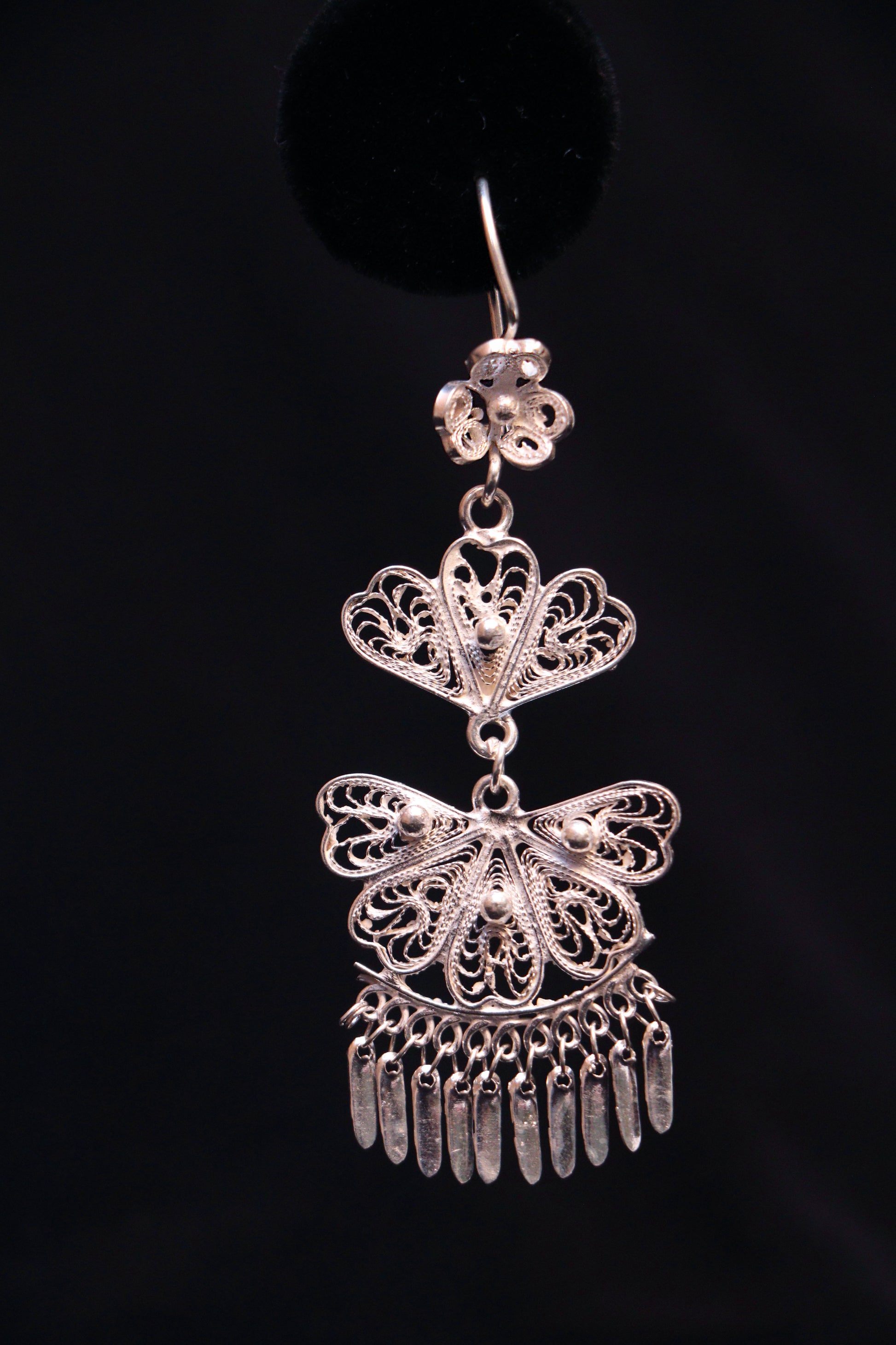 These exquisite dangle earrings showcase Mexican artistry, featuring delicate sterling silver filigree with ornate scrollwork throughout. Each pair is individually handmade from 925 sterling silver, ensuring authentic character and subtle variations that celebrate the artisan's meticulous technique. The intricate detailing and elegant design make these earrings a refined addition to any collection that reflect the handcrafted nature of this one of a kind piece.